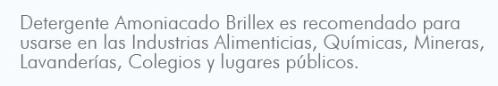 DETERGENTE AMONIACADO BRILLEX, limpia y desengrasa al instante superficies de cocina, campanas, hornos, baños y azulejos, pisos y puertas, eliminando además todo tipo de ceras y grasas de origen animal y mineral en pisos y sintéticos (baldosas, baldosines, linóleo y plásticos).